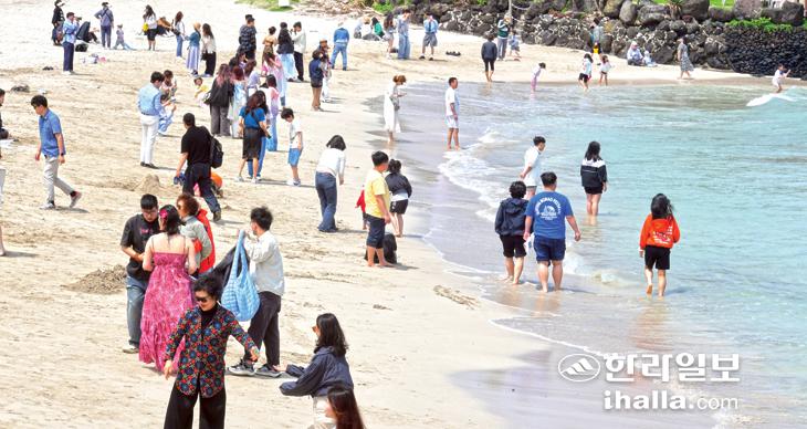 전날까지 쏟아졌던 비가 그친 6일 제주시 함덕해수욕장에서 관광객들이 가벼운 옷차림으로 바다를 구경하고 있다. 이상국기자