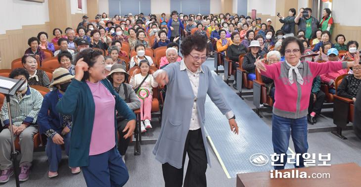 어버이날을 이틀 앞둔 6일 제주시 조천 주민교류센터에서 경로잔치가 열려 참석한 어르신들이 흥겨운 시간을 보내고 있다. 이상국기자