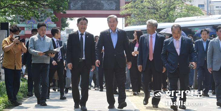 7일 오후 서귀포시 서복거리 지정을 기념해 참석자들이 코스를 걸어보고 있다. 이상국기자