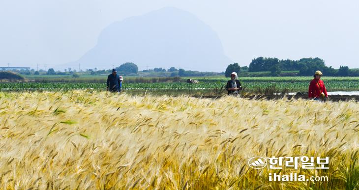 7일 관광객들이 서귀포시 대정읍 알뜨르비행장 인근의 노랗게 익어가는 보리밭 인근을 걷고 있다. 이상국기자