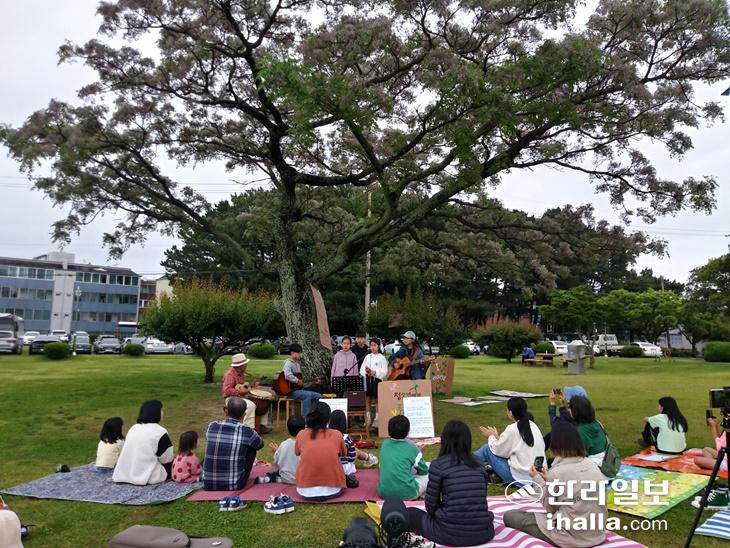 12일 서귀포학생문화원 잔디 광장에서 서귀포시 도시우회도로 녹지공원화를 요구하는 회견에 함께한 어린이들의 공연이 열리고 있다. 진선희기자