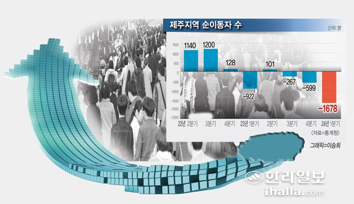 [한라일보] 지난해 제주로 전입한 인구보다 전출 인구가 더 많아 14년만에 인구 순유출((-1687명)이 발생한 후 올해 들어서도 젊은층 중심의 탈제주 현상이 멈추지 않고 있다. 인구 순유출에다 저출생 고령화로 인한 인구 자연감소까지 더해져 주민등록인구도 작년 5월부터 전월 대비 계속 줄어들고 있다.