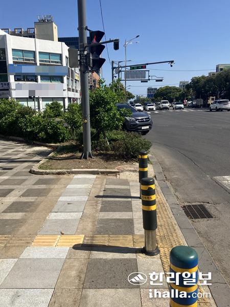 시각장애인들의 불편은 횡단보도에도 이어졌다. 이날 연동의 한 사거리 횡단보도 앞 바닥에는 점자블록이 설치돼 있었지만, 음향신호기 버튼까지 이어지지 않았다. 심지어 신호기는 횡단보도 옆 턱이 있는 화단 안쪽에 자리했으며, 화단 입구부터 신호기가 있는 자리까지의 거리도 100여 m나 돼 시각장애인이 이용할 수 없었다. 오히려 설치된 점자블록 인근에는 신호기 대신 햇빛을 피할 수 있도록 설치한 그늘막이 자리하면서 이용자들의 혼선이 우려됐다.