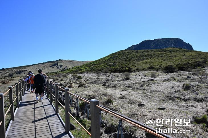 19일 제주 한라산을 찾은 탐방객들이 윗세오름을 오르고 있다. 강희만기자