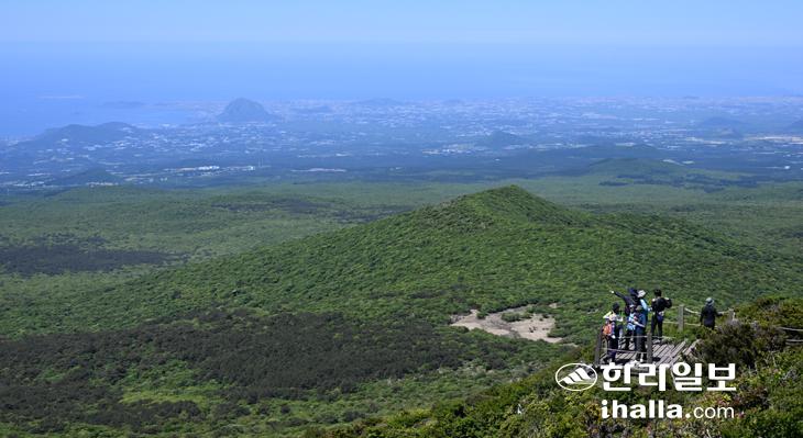 화창한 날씨를 보인 19일 한라산 영실 등반로에서 바라 본 서귀포시 대정읍 일대. 산방산과 바다가 선명하게 보인다. 강희만기자