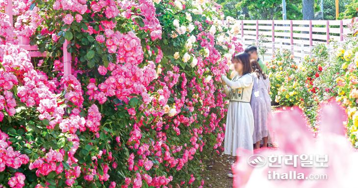 18일 제주시 조천읍 한 카페 정원에 분홍빛의 장미가 만개해 시선을 사로잡고 있다. 이상국기자
