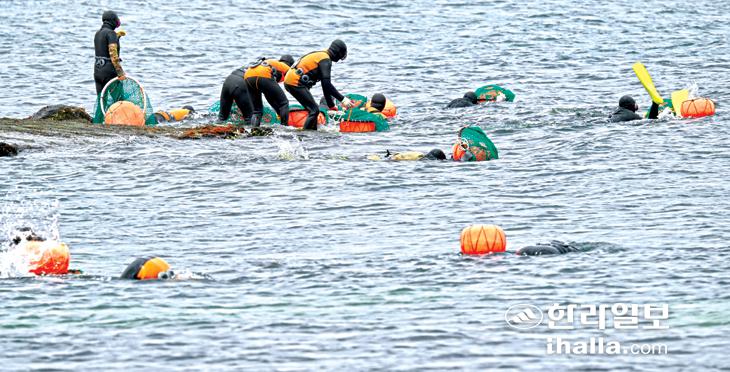 "오늘의 목표는 우뭇가사리"21일 제주시 구좌읍 하도리 해안가에서 해녀들이 우뭇가사리 채취를 위해 바다로 나가고 있다. 강희만기자