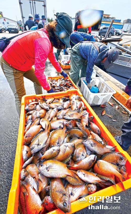 22일 서귀포시 대정읍 모슬포항에 많은 도민들이 찾아 제철을 맞은 자리돔을 구매하고 있다. 강희만기자