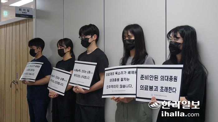 이날 의대생 30여 명은 검은 마스크를 쓰고 제주대 본관에서 '의료계 목소리가 배제된 의대 증원 절차는 민주적이지 않습니다', '준비 안 된 의대 증원 의료 붕괴 초래한다'는 등의 내용이 적힌 피켓을 들고 시위를 벌였다.