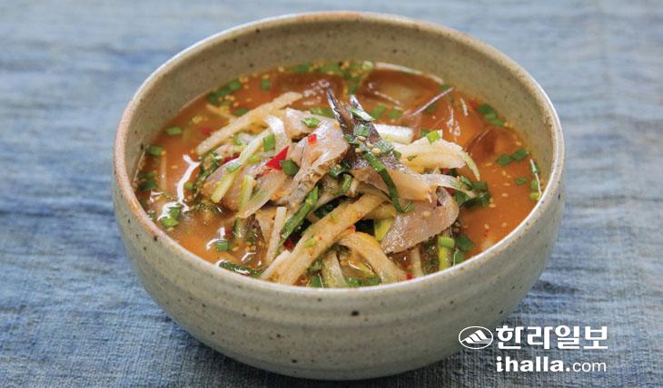 그중에서도 여름에 가장 인기 있는 건 '물회'다. 제주에는 '한여름 자리물회 다섯 번만 먹으면 보약이 필요 없다'는 말이 있을 정도다. '톡 쏘는 재피 맛에 구수한 된장을 풀어'(한기팔 '자리물회') 시원하게 낸 한 그릇은 기호에 따라 선호도가 갈리지만, 제주의 '여름 맛'이라고 할 수 있다. 정말 먹어본 사람만이 아는 맛이다.