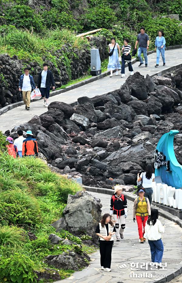 초여름 같은 날씨를 보인 23일 제주시 애월읍 곽지리 좀녀의 길을 찾은 관광객들이 한가롭게 걸으며 5월 제주 바다 풍경을 감상하고 있다. 강희만기자