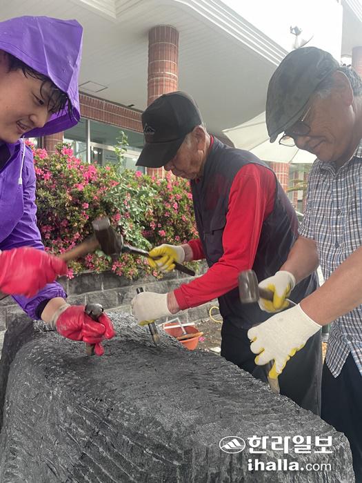 공예 축제 마지막 날인 26일 신효마을회관 앞에서 '돌하르방 함께 만들기'가 진행되고 있다. 송종원 석공예 명장의 손길에 지역 주민들의 체험이 더해진 돌하르방은 6월 1일쯤 마을회관 앞에 세워질 예정이다. 신효마을회 제공
