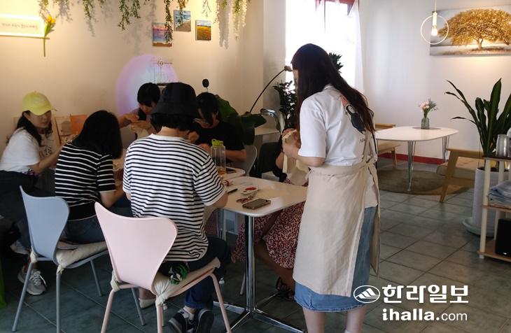 공예축제 기간에 '한 평 공예' 체험장으로 변신한 신효마을의 한 카페에서 지난 23일 체험이 진행되고 있다. 진선희기자
