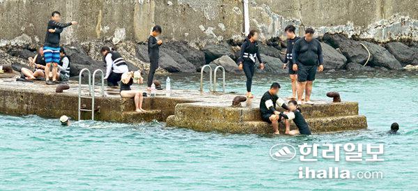 26일 제주시 한림읍 판포포구를 찾은 관광객들이 물놀이를 즐기며 주말을 보내고 있다. 강희만기자