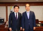 오영훈 제주지사와 이상민 행안부 장관이 31일 제주국제컨벤션센터 VIP룸에서 만나 악수를 하며 기념촬영을 하고 있다. 사진=제주도