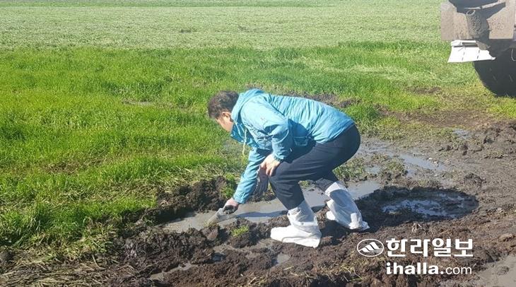 서귀포시가 가축 분뇨 관련 시설 점검에서 자원화되지 않은 가축 분뇨 액비 살포 현장을 확인하고 있다. 서귀포시 제공