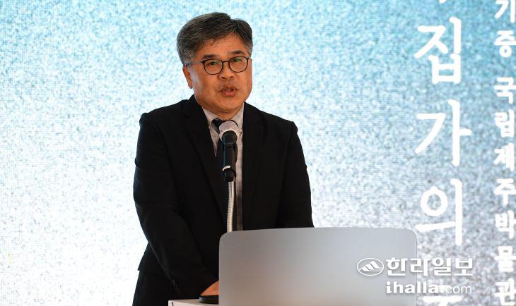 '어느 수집가의 초대-고 이건희 회장 기증 국립제주박물관 특별전' 개막을 하루 앞둔 3일 열린 언론 공개회에서 인사말을 하고 있는 박진우 국립제주박물관장. 이상국기자