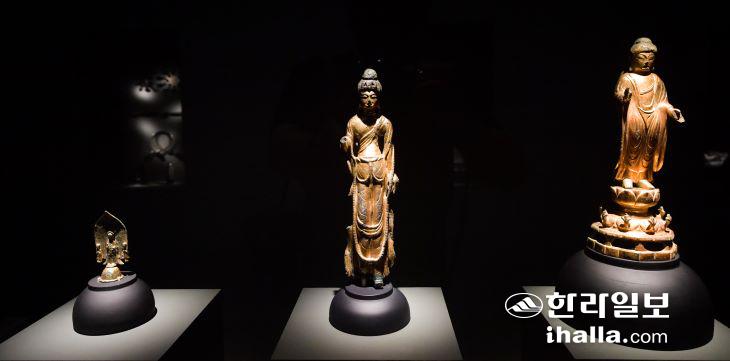 왼쪽부터 국보인 삼국시대 금동불 일광삼존상과 보물인 보살(금동보살입상), 부처(금동여래입상). 3부 전시공간에서 만나볼 수 있다. 이상국기자