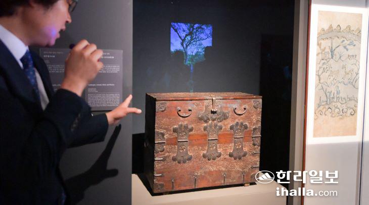 '어느 수집가의 초대' 고 이건희 회장 기증 국립제주박물관 특별전' 개막을 하루 앞둔 3일 열린 언론 공개회에서 이재호 학예연구사가 전시투어를 통해 전시작품에 대해 설명하고 있다. 1부 전시공간에서 만나볼 수 있는 제주궤. 이상국기자