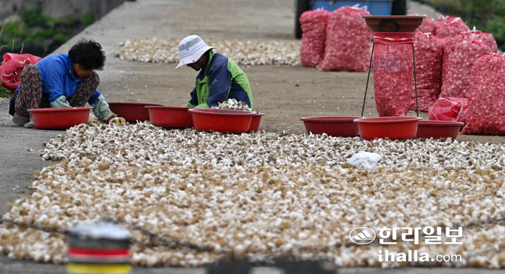 지난 5일 제주시 한경면 용수리 포구에서 마늘 말리기 작업 중인 농민들의 모습이 정겨워 보인다. 강희만기자