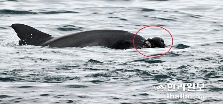 지난 5일 서귀포시 대정읍 해안에서 어미 남방큰돌고래가 죽은 새끼를 주둥이 위에 올리고 유영하고 있다. 강희만기자