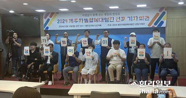 제주도내 14개 시민사회단체 및 정당 등으로 구성된 ‘2024 제주차별철폐대행진공동기획단’이 10일 제주도의회 도민카페에서 차별철폐 대행진 선포 기자회견을 열었다.