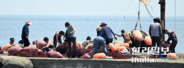 10일 제주시 구좌읍 하도리 해안가에서 해녀들이 우뭇가사리 채취 후 정리 작업을 하고 있다. 강희만기자