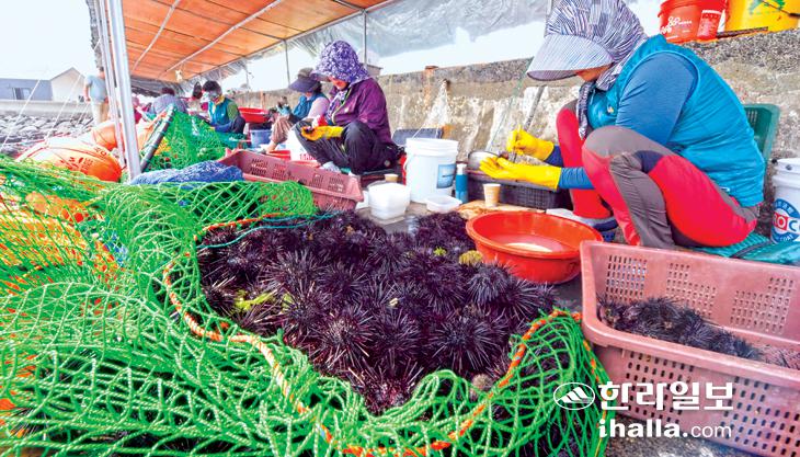 12일 제주시 조천읍 함덕리 바닷가에서 해녀들이 갓 잡은 성게를 손질하고 있다. 이상국기자
