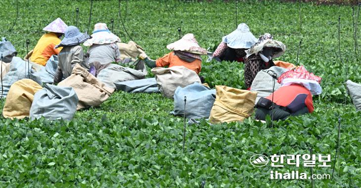 12일 초여름 날씨 속에 제주시 애월읍 봉성리 농경지에서 농민들이 취나물 수확 작업으로 구슬땀을 흘리고 있다. 강희만기자