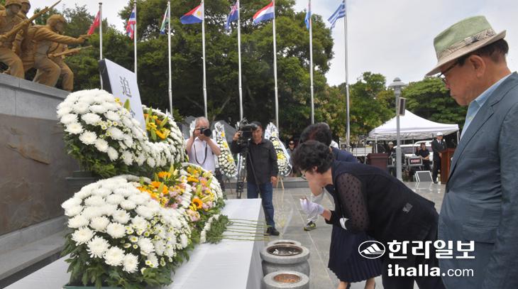 12일 제주시 신산공원에서 열린 '제13회 6·25 호국영웅 4인 및 호국영령 합동 추념식'에서 유족들이 참배하고 있다. 이상국기자