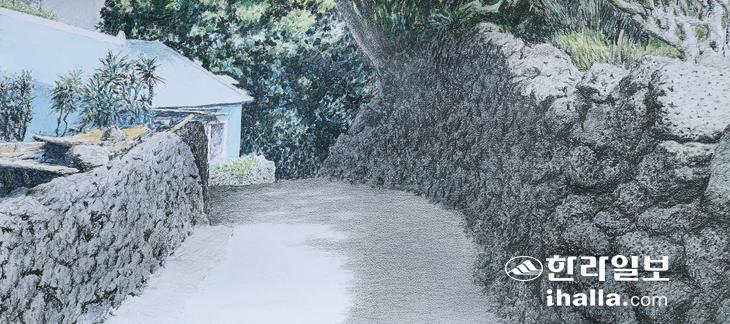 유월의 태양은 가장 밝고 환하게 아침을 만든다. 녹음이 우거진 계절에 유구한 역사를 가진 마을의 아침풍경을 그린다는 것은 옛모습을 그대로 간직한 긴올레 만한 것이 없어서 그렸다. 현무암 돌담이 보유하고 있는 질감과 색을 그대로 표현하기 위해 짙은 연필로 담채화 분위기를 유도하면서 눈부신 햇살을 그리기 위한 전초기지로 활용했다. 돌과 나무를 가지고 빛을 노래하는 그런 구조다. 집으로 들어가는 길은 농촌마을 서정성 그대로다. 얼마나 오래 전에 저 돌담을 쌓아 진입로를 만들었는지 돌들에게 물으니 족히 수 백 년은 걸렸을 것이라는 대답.