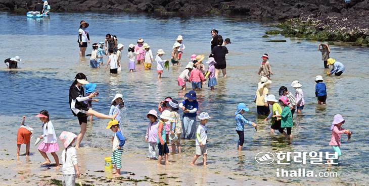 맑은날을 보인 13일 제주시 곽지해수욕장을 찾은 어린이집 원아들이 물놀이를 즐기고 있다. 강희만기자