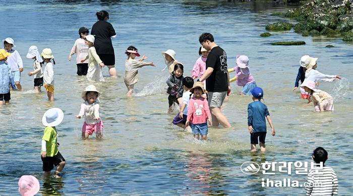 맑은날을 보인 13일 제주시 곽지해수욕장을 찾은 어린이집 원아들이 물놀이를 즐기고 있다. 강희만기자
