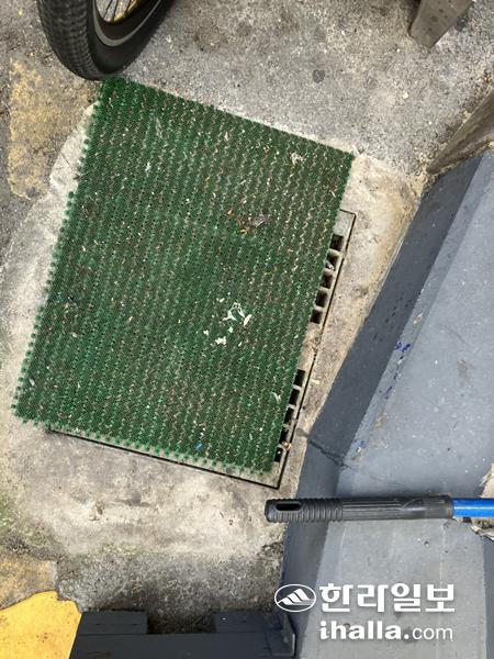 17일 제주시 이도1동의 한 집수구가 발판으로 덮여있어 호우 시 침수피해 등이 우려되고 있다.