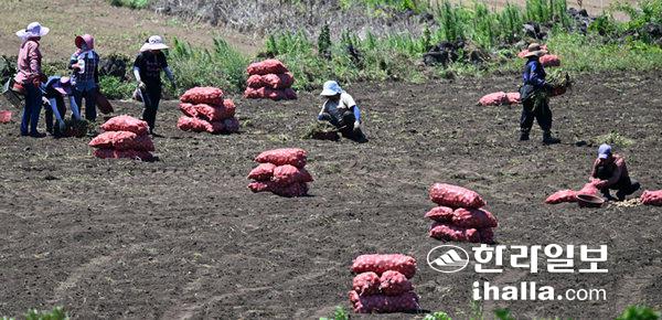18일 제주시 구좌읍 종달리 한 농경지에서 농민들이 감자 수확 작업을 하고 있다. 강희만기자