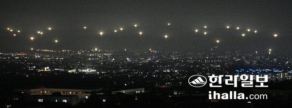 지난 17일 늦은 밤 제주시내 야경과 수많은 어선들이 켜놓은 집어등 불빛이 어우러지며 불야성을 이루고 있다. 강희만기자