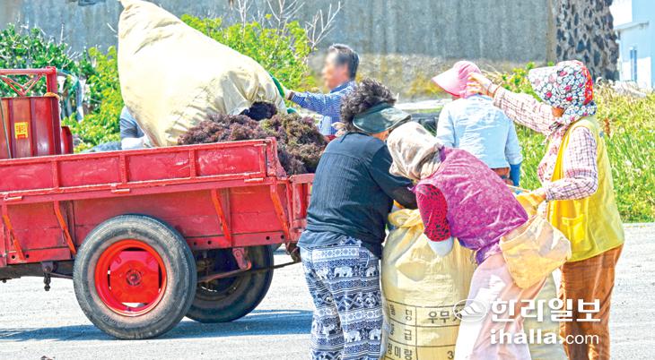 18일 제주시 구좌읍 행원리 부둣가에서 해녀들이 말린 우뭇가사리를 경운기에 옮겨 싣고 있다. 강희만기자
