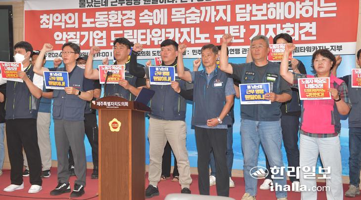 민주노총 관광레저산업노도 드림타워카지노지부는 19일 오전 제주도의회 도민카페에서 기자회견을 열고 "최악의 노동환경속에 목숨까지 담보해야하는 악질기업 드림타워카지노를 규탄한다"고 밝혔다.