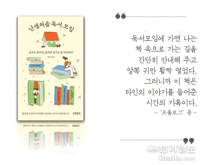 [한라일보] 저자가 "오로지 독서모임에서 만난 사람과 책에 관한 이야기로만 채우려고 노력했다"고 소개하듯, 책 '난생처음 독서 모임'(티라미수 더북 펴냄)은 7년째 독서 모임을 운영하고 있는 김설 작가가 들려주는 좋은 책과 독서모임, 그리고 그곳에서 만난 사람들에 대한 이야기다. '혼자도 좋지만, 혼자만 읽기는 좀 허전해서'라는 부제처럼, 책을 읽는 것으로 모자라 모임을 만들어 함께 읽는 사람들과 거기서 만들어지는 반짝이는 순간들이 가득하다.