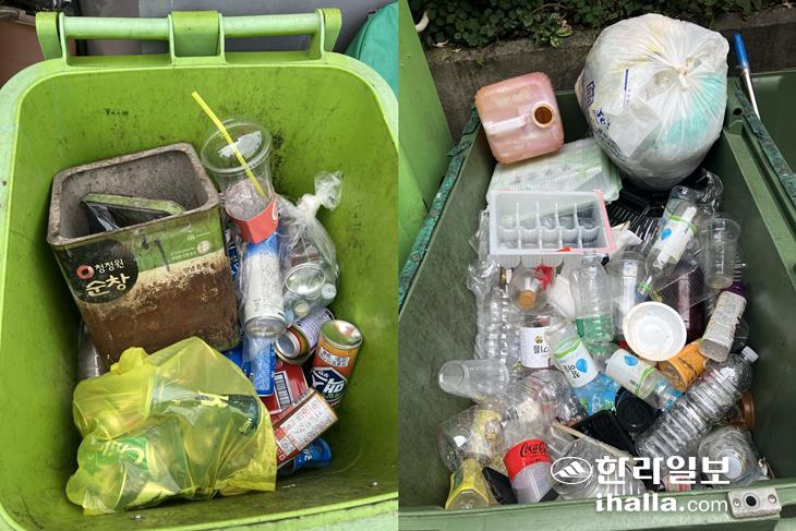 제주시 일도1동, 연동 투명페트병 배출함에 각종 재활용품들이 뒤섞여 있다.