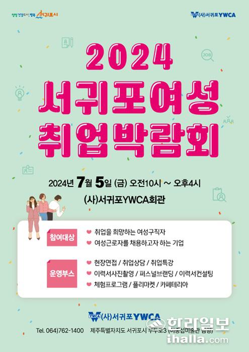 [한라일보]제주 서귀포시와 (사)서귀포YWCA는 7월 5일 오전 10시부터 오후 4시까지 서귀포YWCA회관(서귀포시 부두로 3)에서 '2024 서귀포여성취업박람회'를 개최한다.