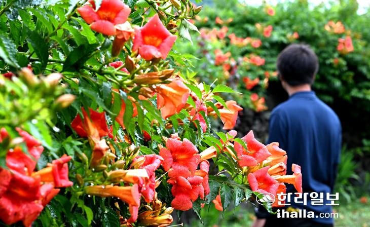 장맛비가 내린 22일 제주시 조천읍 선흘리 덩굴원에 빨간 능소화가 만개해 눈길을 끌고 있다. 강희만기자
