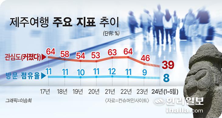 2023년 여행 소비자의 제주도에 대한 관심도는 46%, 계획 점유율13%, 방문 점유율은 9%로 3개 지표 모두 조사가 시작된 2017년 이후 최저를 기록했다. 올해 들어서도 상황은 더 악화하는 분위기다.