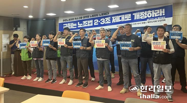 민주노총 제주본부가 25일 제주도의회 도민카페에서 노조법 2·3조 개정안 통과를 촉구하는 기자회견을 열고 있다.