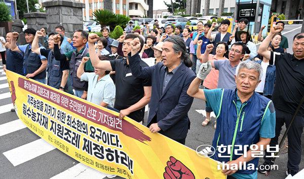 제주지역 농민 단체들로 구성된 '제주 농민의 길'은 25일 제주도청 앞에서 회견을 열고 "2021년 요소수 대란으로 폭등한 비료·농약 등 농자재 가격이 떨어질 기미가 없어 농민의 삶을 옥죄고 있다"며 '필수 농자재 지원 조례 제정을 위한 주민 발의'를 선포했다. 단체는 조례 제정을 위한 서명 운동에 나선다고 밝혔다. 강희만기자