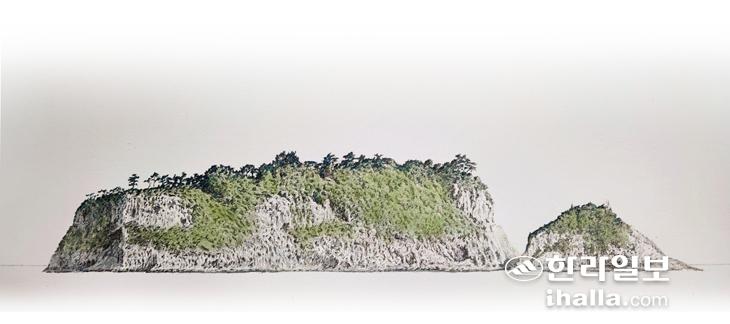 장마철에 느껴지는 회색 구름의 은은함을 공간적 배경으로 범섬을 그렸다. 절벽이 주는 독특함은 광선과의 만남에 있어서 하나의 환상이다. 바위에 뿌리를 내리고 살아남는 저 생명력에 대한 경외심을 그리는 것은 이 섬에서 숱한 고난과 함께 살아온 선조들의 정신을 그리는 것이라 과도한 해석을 낳게 하였으니, 그리면서 치미는 망상을 부질없다 할 것인가? 범섬은 부모와 자식 관계다. 서쪽에 자녀를 두고 항시 걱정을 놓지 못하는 부모. 어여쁘기도 하거니와 보듬어주지 못함을 안타까워하는 형상이다.