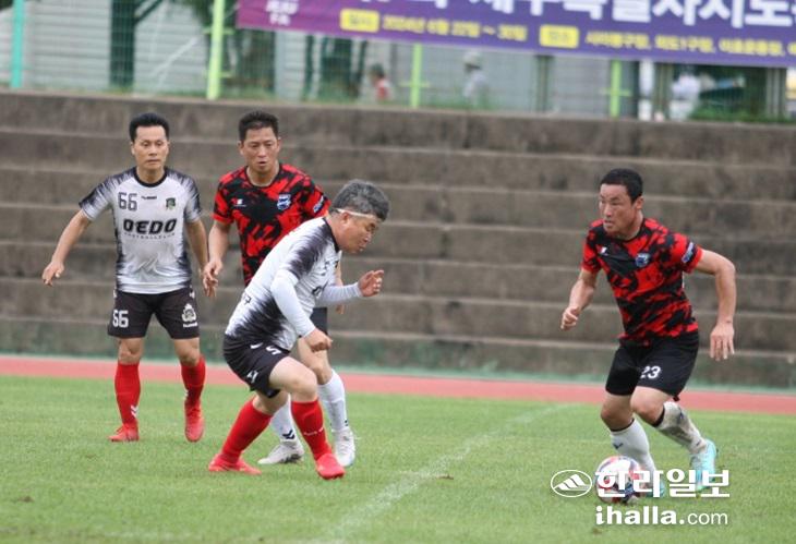 30일 제주시 애향운동장에서 열린 제7회 제주특별자치도축구협회장기 전도축구대회 노장부(50대) 결승전에서 우리FC의 김민철(오른쪽)이 외도축구회 선수의 마크를 뚫고 돌파를 시도하고 있다.