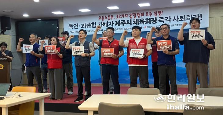 민주노총 제주본부와 전국민주일반노조 제주본부가 2일 제주도의회 도민카페에서 제주시 체육회장 갑질 규탄 및 사퇴를 촉구하는 기자회견을 열고 있다.