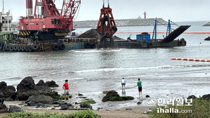 [한라일보] 7월부터 개장해 본격적으로 손님맞이에 나선 서귀포시 화순금모래해수욕장에서 대규모 준설 공사가 진행되면서 눈살을 찌푸리게 하고 있다. 특히 해수욕장과 불과 50여m 떨어지지 않은 곳에서 준설 공사가 진행되며 피서객 등의 안전사고도 우려된다.