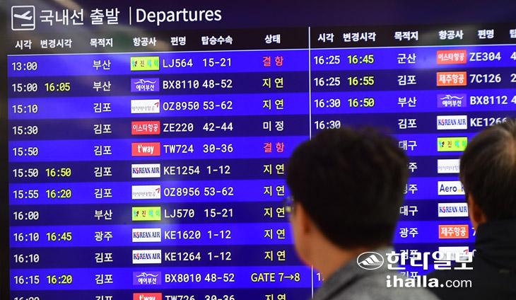 제주도 전역에 강풍 특보가 내려진 2일 제주국제공항을 오가는 항공기 수십편이 지연·결항됐다. 이상국기자